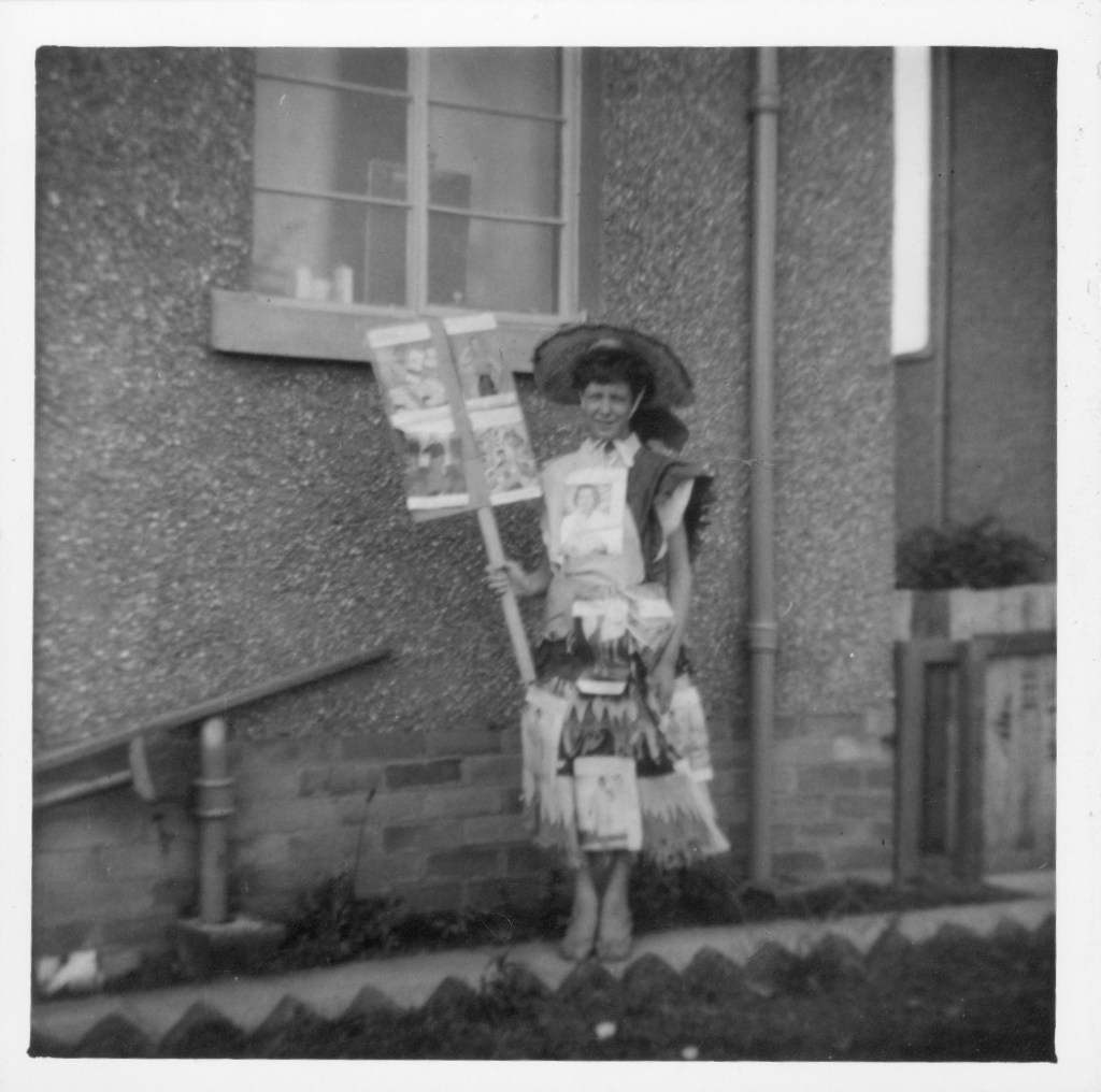 Mrs Margaret Bricknall of Drylie Street in Cowdenbeath submitted these memories of our Gala Day, showing her sister, Rena Martin, dressing up for the Parade with her outfit made from magazine covers.