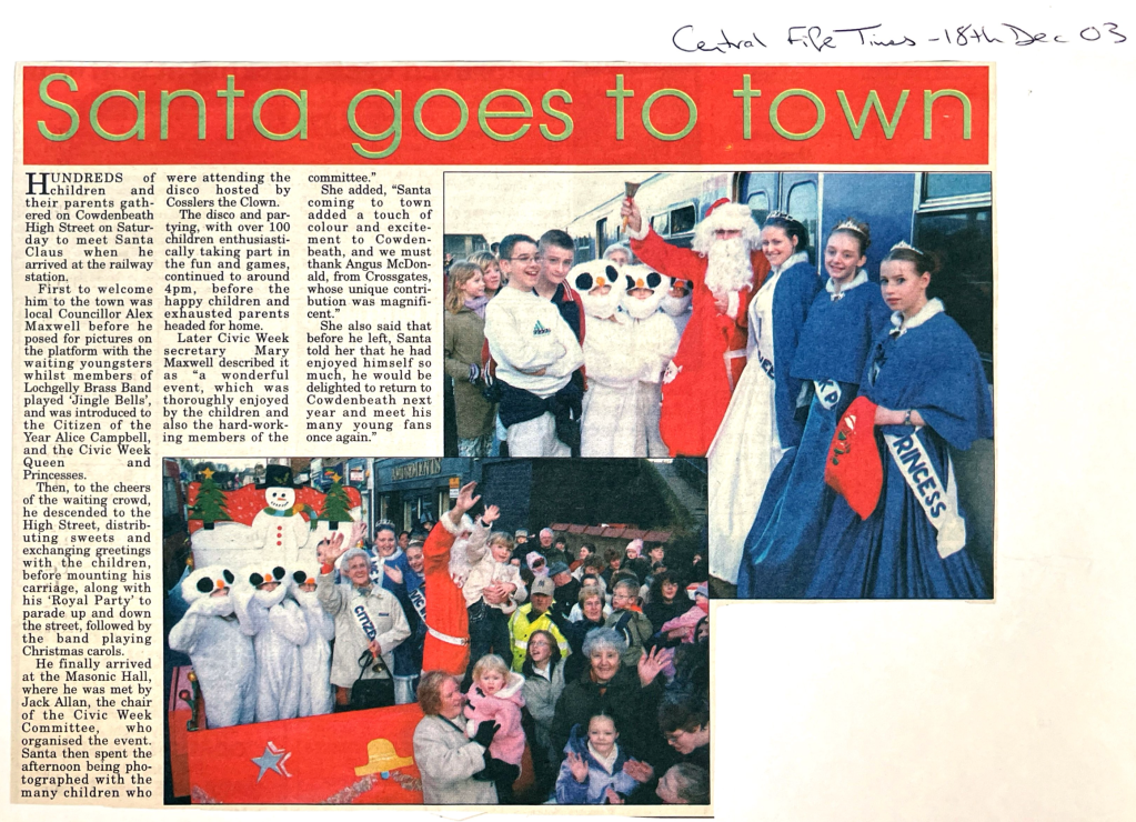 Coverage of our Xmas events and Santa Visit here in the Central Fife Times 18th December 2003.